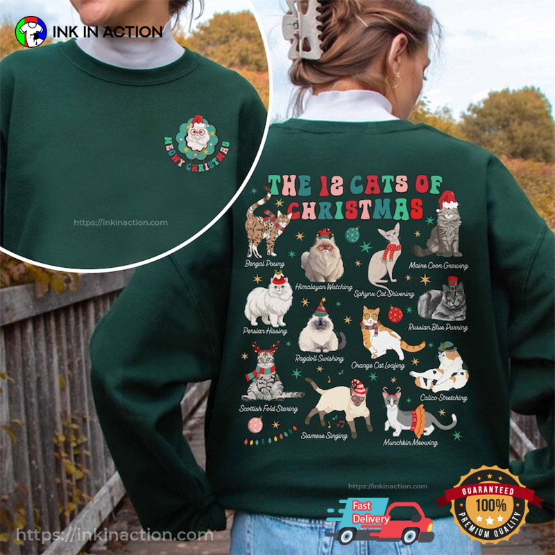 The 12 Cats Of Christmas Meow Christmas 2 Sided T-shirt